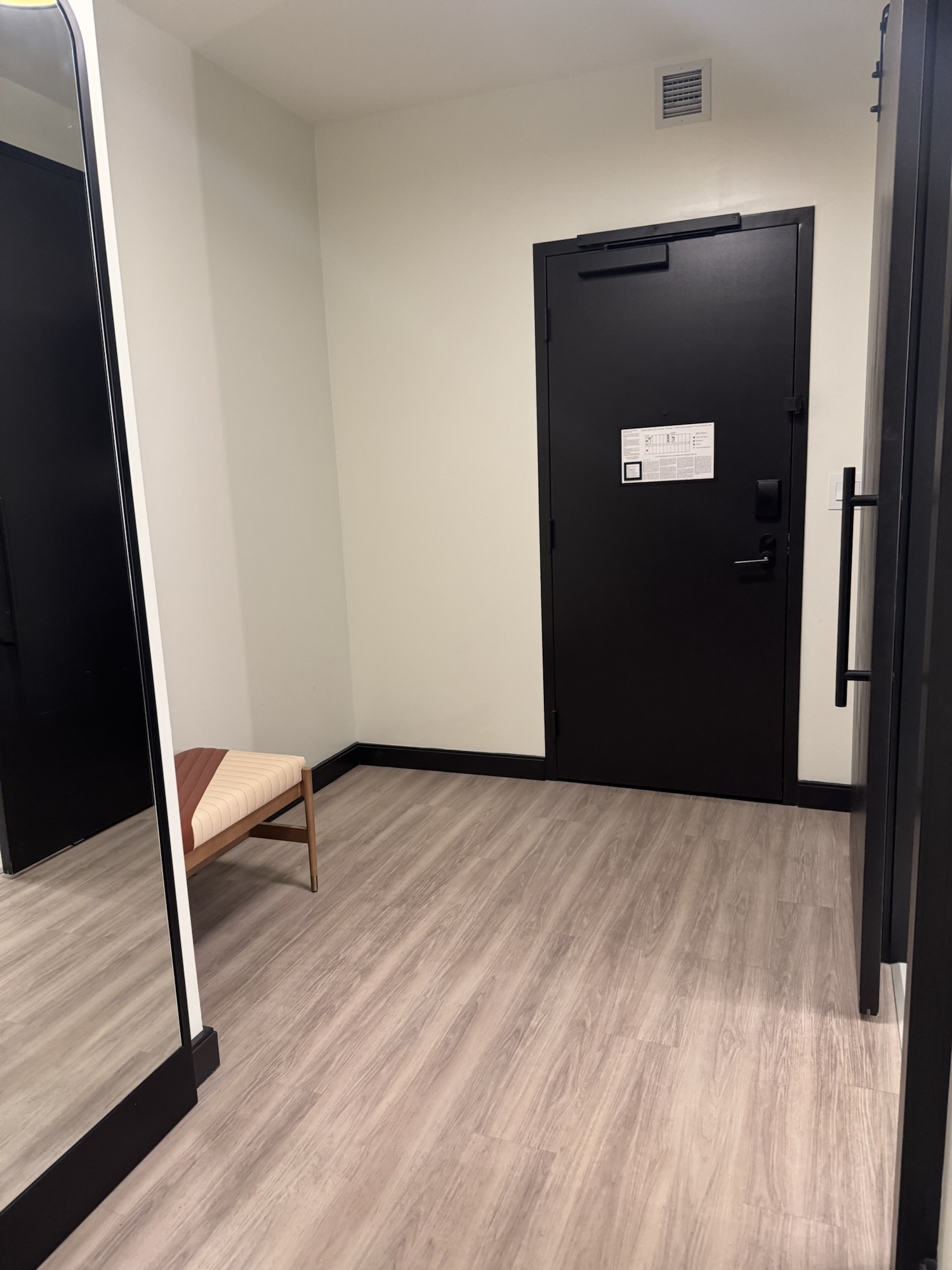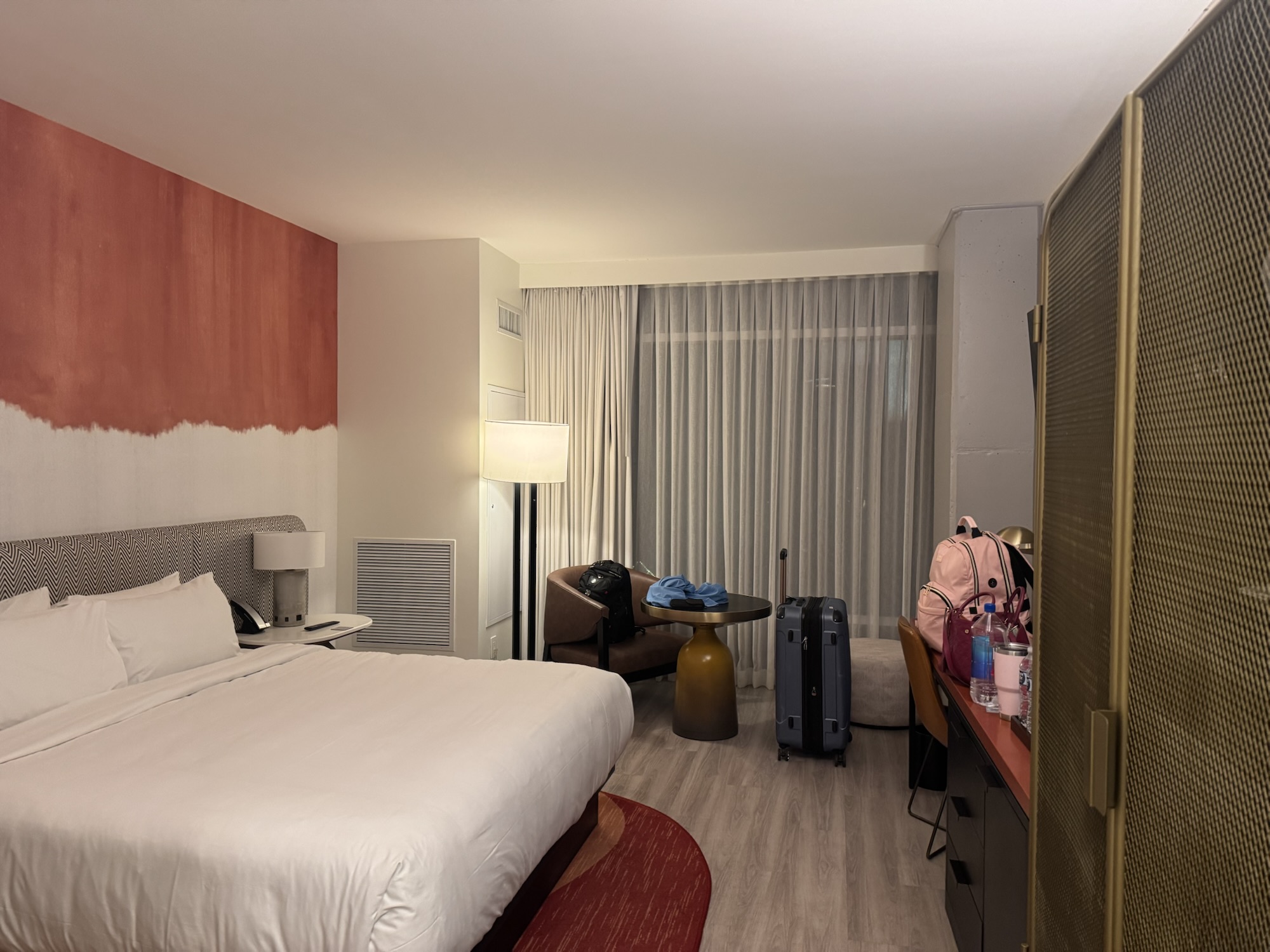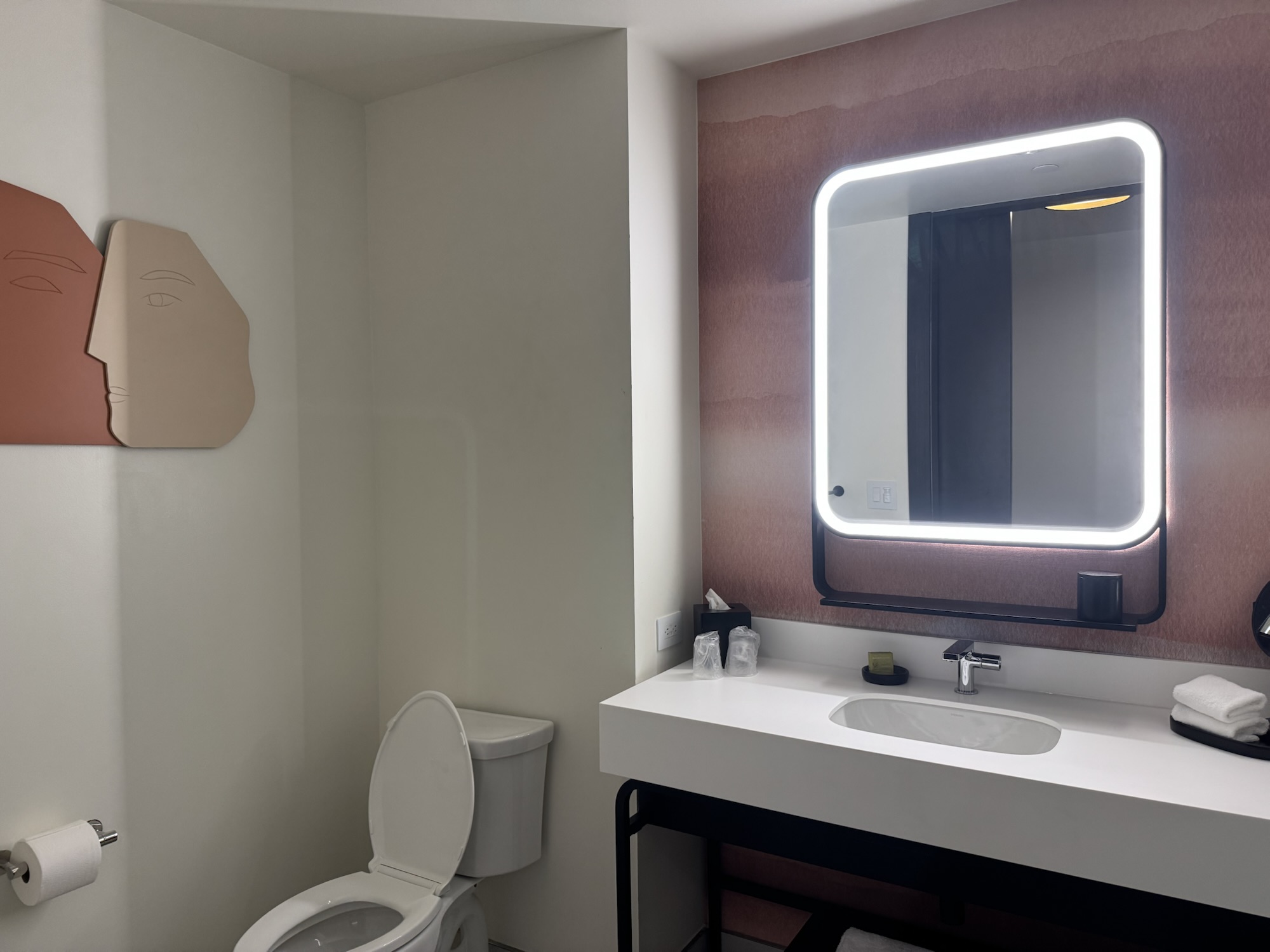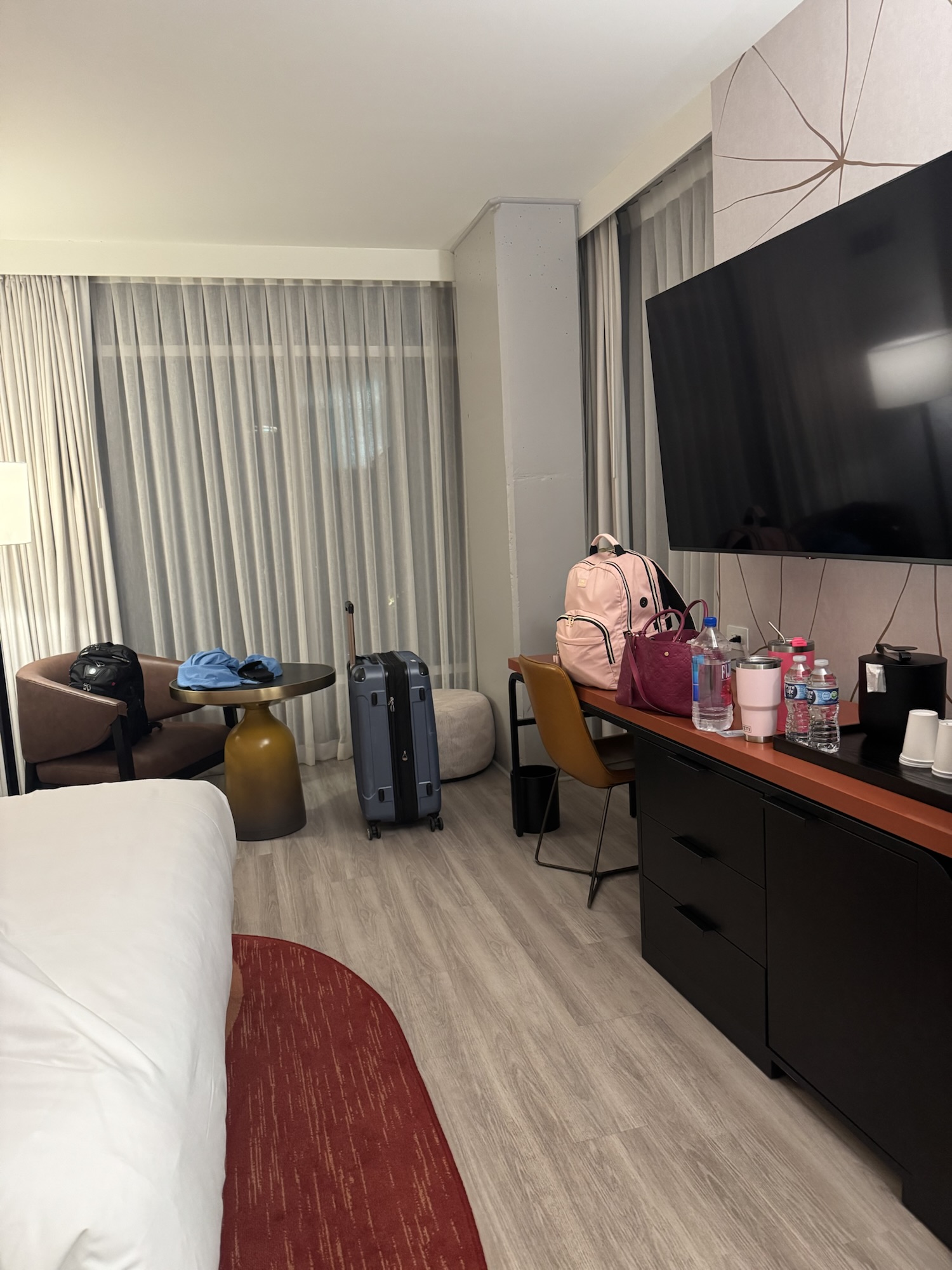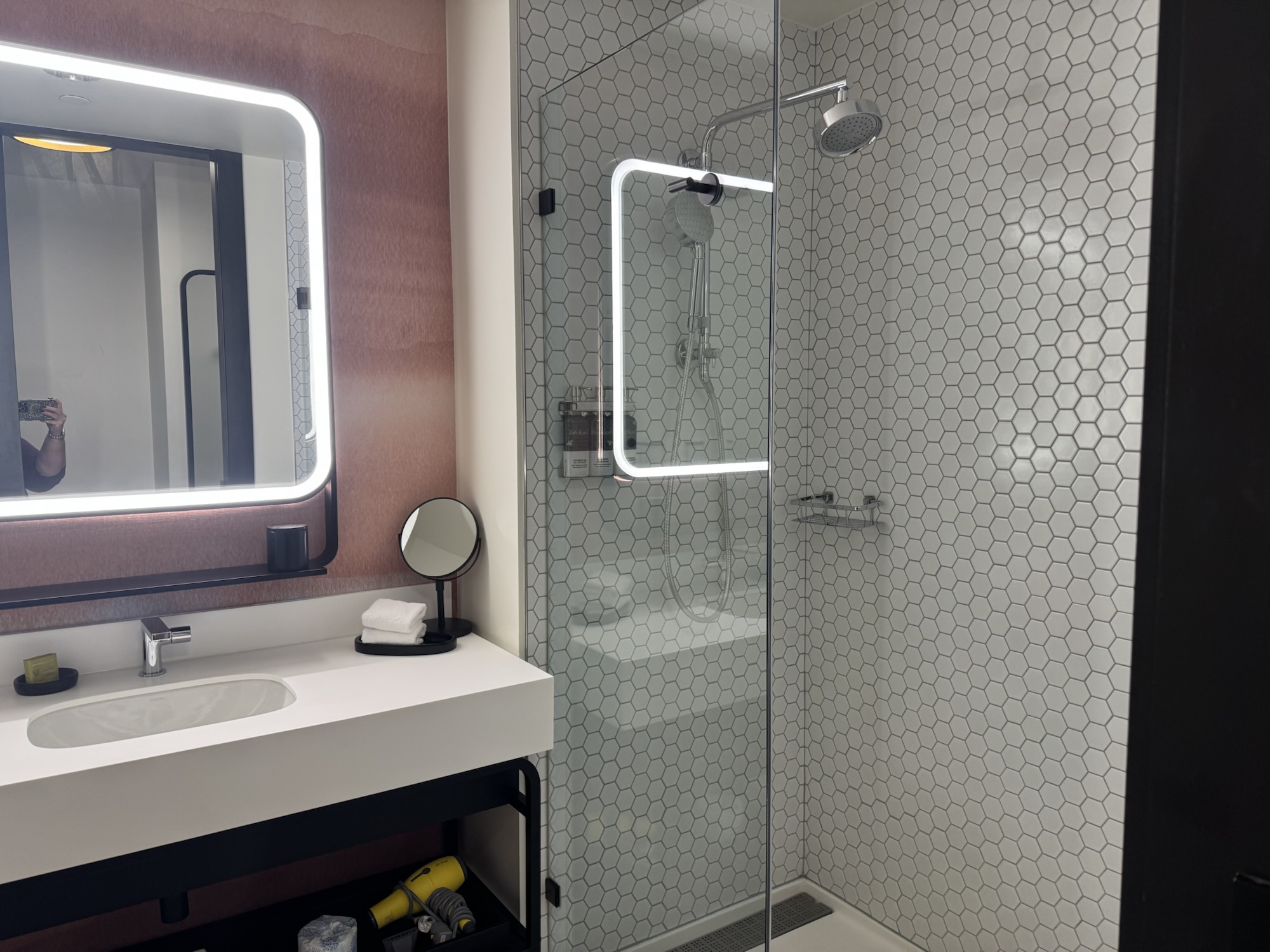 From the moment we walked in, this hotel felt fresh, modern, and thoughtfully designed. The room was spacious, spotless, and calming — light wood floors, soft lighting, and a contemporary layout that made it feel more like a chic apartment than a typical hotel room. The bathroom was beautifully done with a bright LED mirror and a gorgeous tile shower. Everything felt clean, new, and intentionally curated.