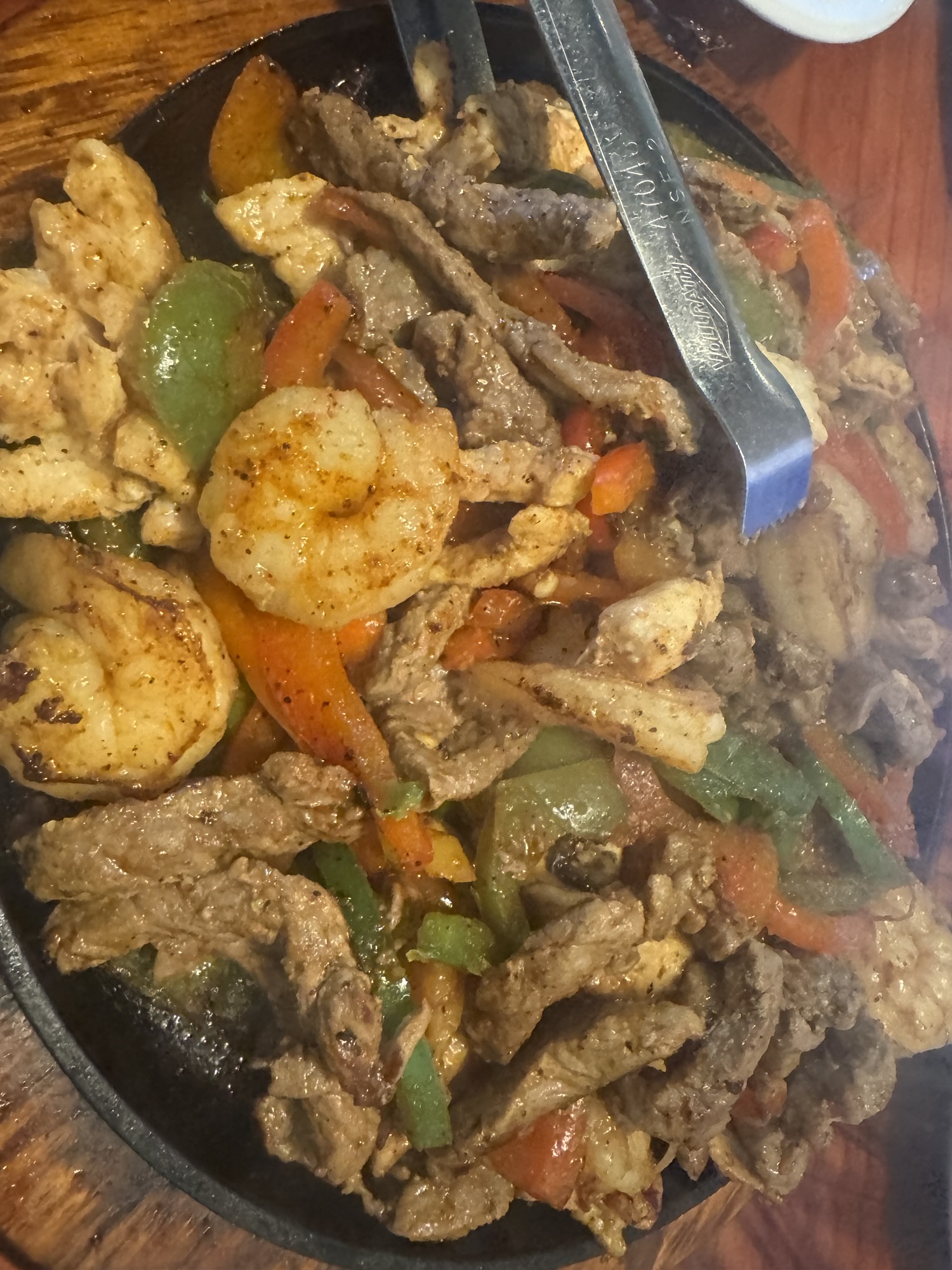 Then we shared the Texas-Style Fajitas — steak, chicken, and shrimp sizzling hot and made fresh to order with no onions, just like we asked. I love when a place is willing to customize! 💕